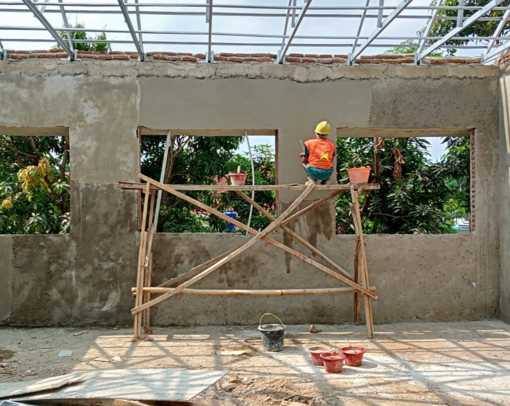 Seluruh pekerja, tukang serta mandor pekerjaannya terlihat rapih saat finishing acian, material semen yang dipergunakan adalah semen tiga roda.