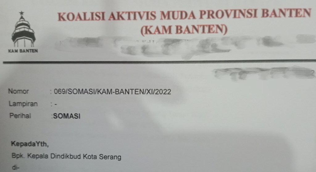 Hal ini dibuktikan dengan surat laporan somasi yang di layangkan dari koalisi aktivis muda provinsi banten (KAM BANTEN) atas temuan kami di lapangan kami meminta dinas pendidikan dan kebudayaan Kota Serang-Banten untuk meninjau kegiatan tersebut.